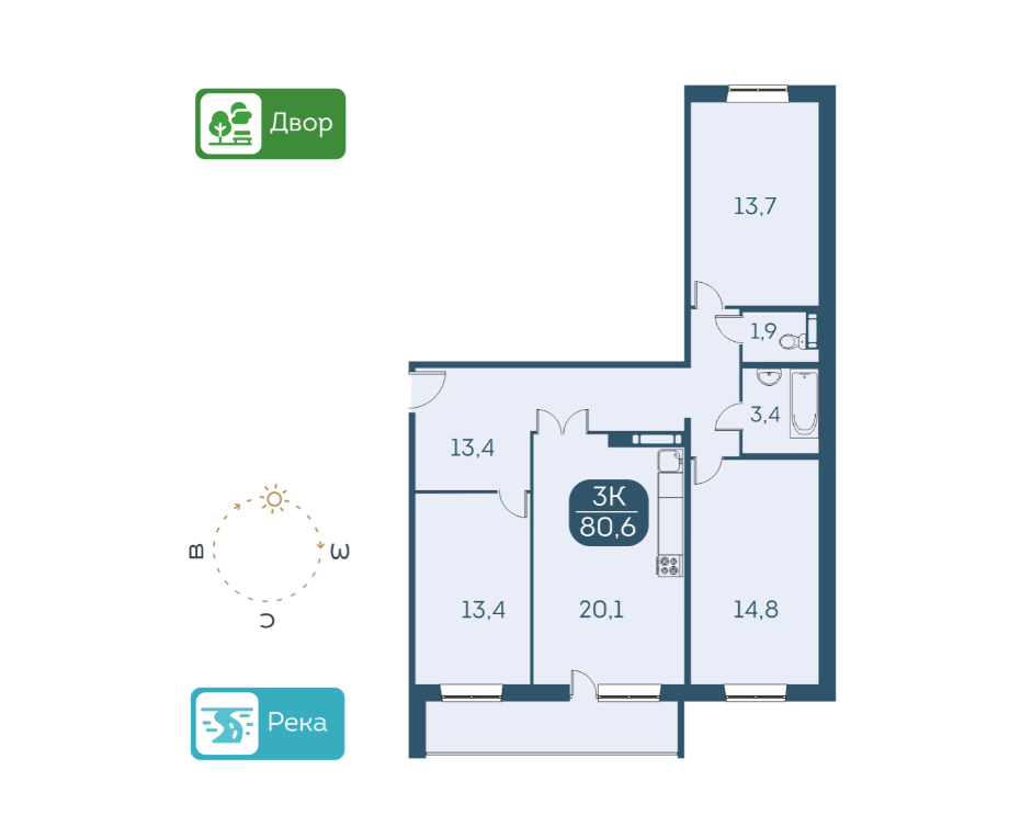 Трёшка 80 м². Ремонт и мебель.